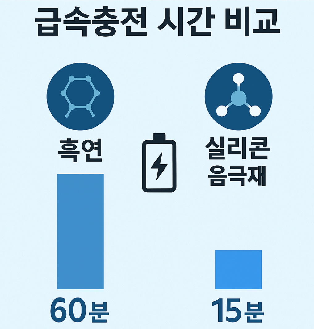 - 실리콘 음극재: 흑연 대비 10배 용량, 급속 충전 가능성 확대